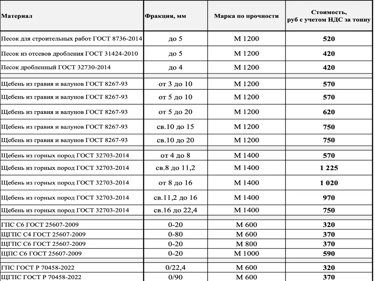 | Добыча | Песок дешевый, Песок качественный, Щебень гравийный (М800-1000), Щебень гранитный (М1200-1400), ПГС, ЩПС |
